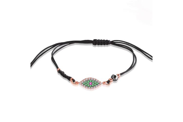 Evil Eye bracelet with black coloured cord made of rose plated sterling silver 925, decorated with white, green and red cubic zirconia.