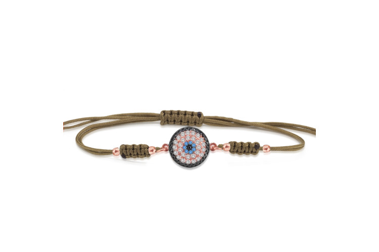 Evil Eye bracelet with beige coloured cord made of rose plated sterling silver 925, decorated with black , light blue and white cubic zirconia.