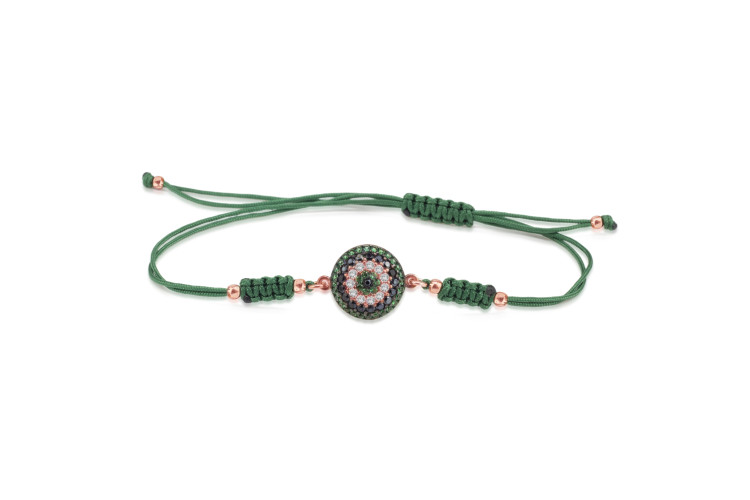 Evil Eye bracelet with green coloured cord made of rose plated sterling silver 925, decorated with green , black and white cubic zirconia.