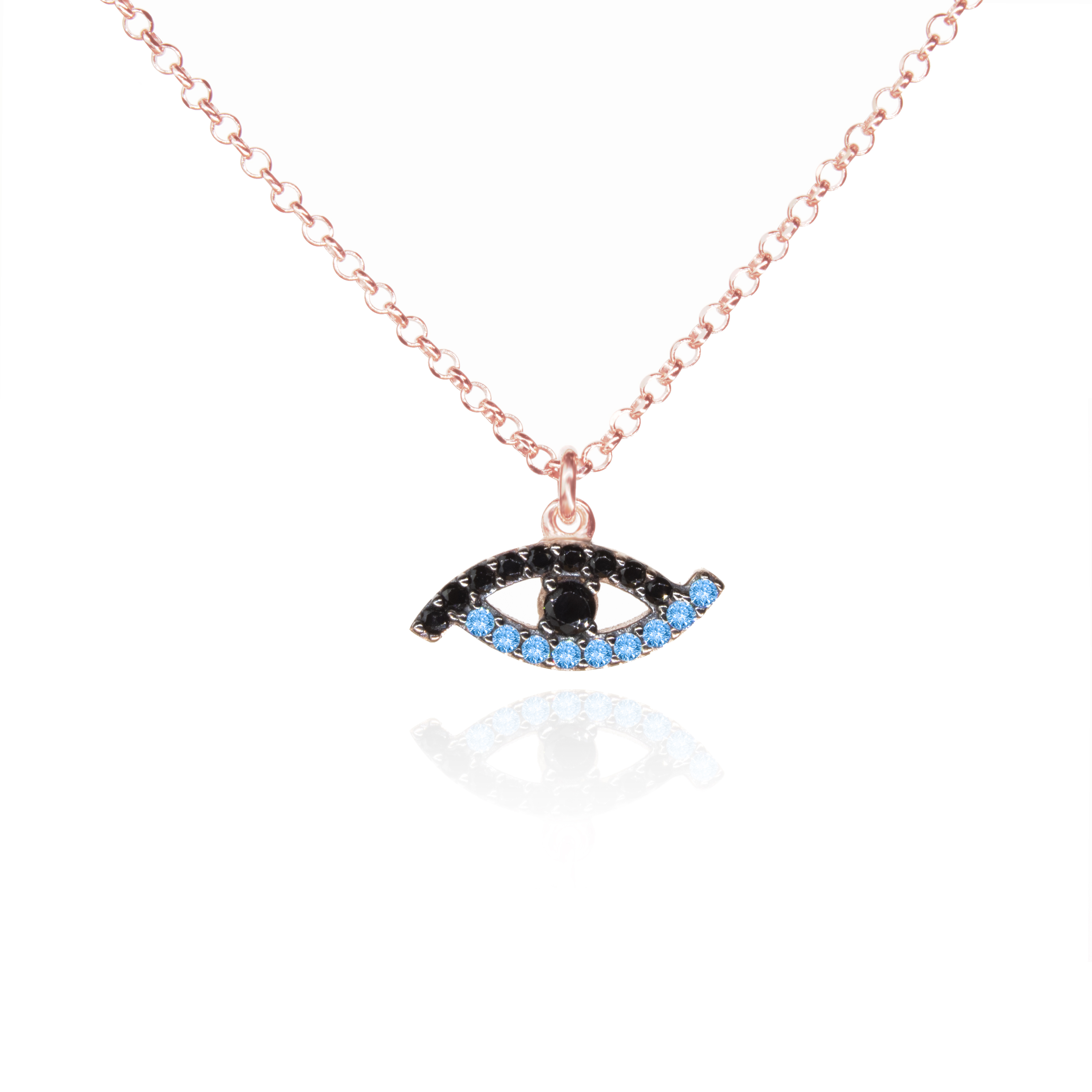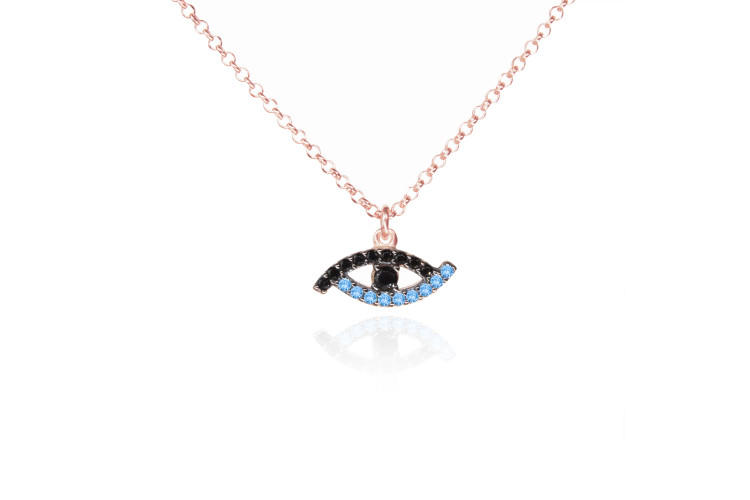 Evil Eye necklace made of rose plated sterling silver 925, decorated with light blue and black cubic zirconia.