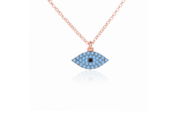Evil Eye necklace made of rose plated sterling silver 925, decorated with light blue and black cubic zirconia.