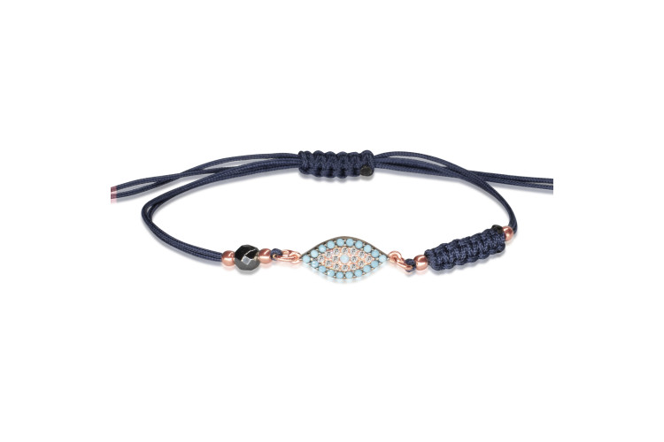 Evil Eye bracelet with blue coloured cord made of rose plated sterling silver 925, decorated with cubic zirconia.