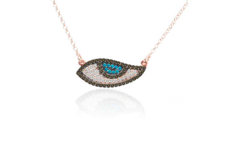 Evil Eye necklace made of rose plated sterling silver 925, decorated with white,light blue and brown cubic zirconia.