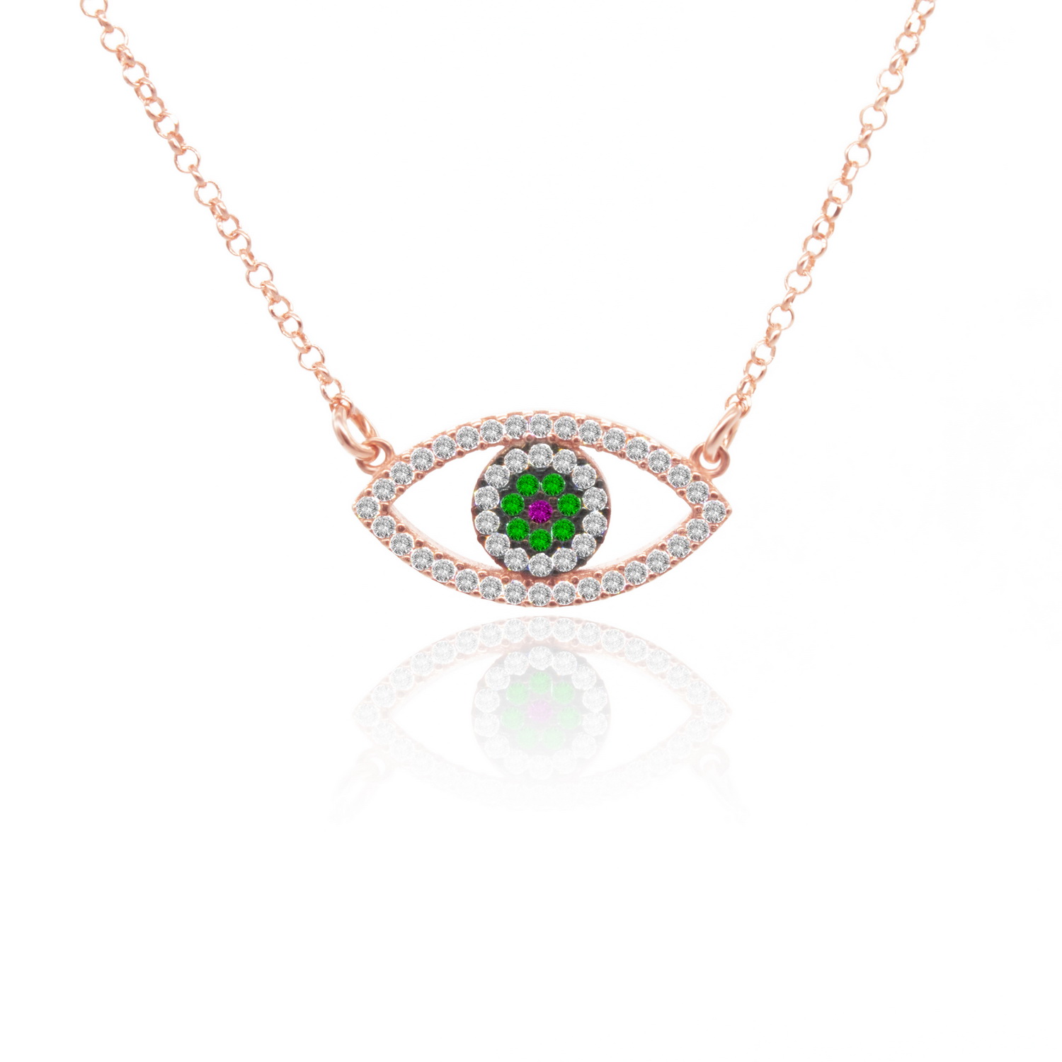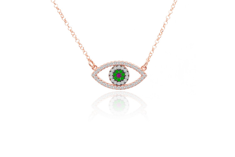 Evil Eye necklace made of rose plated sterling silver 925, decorated with white green and red cubic zirconia.