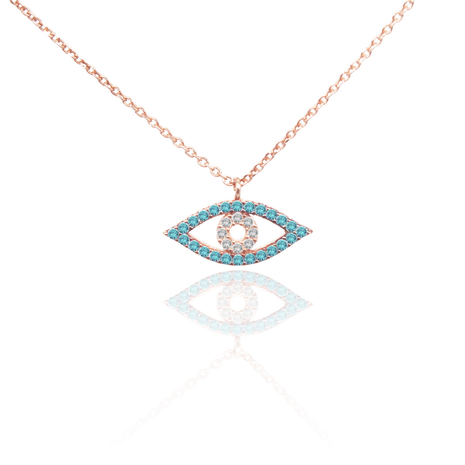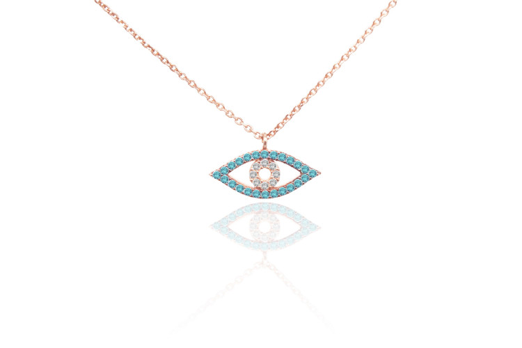 Evil Eye necklace made of rose plated sterling silver 925, decorated with white and light blue cubic zirconia.