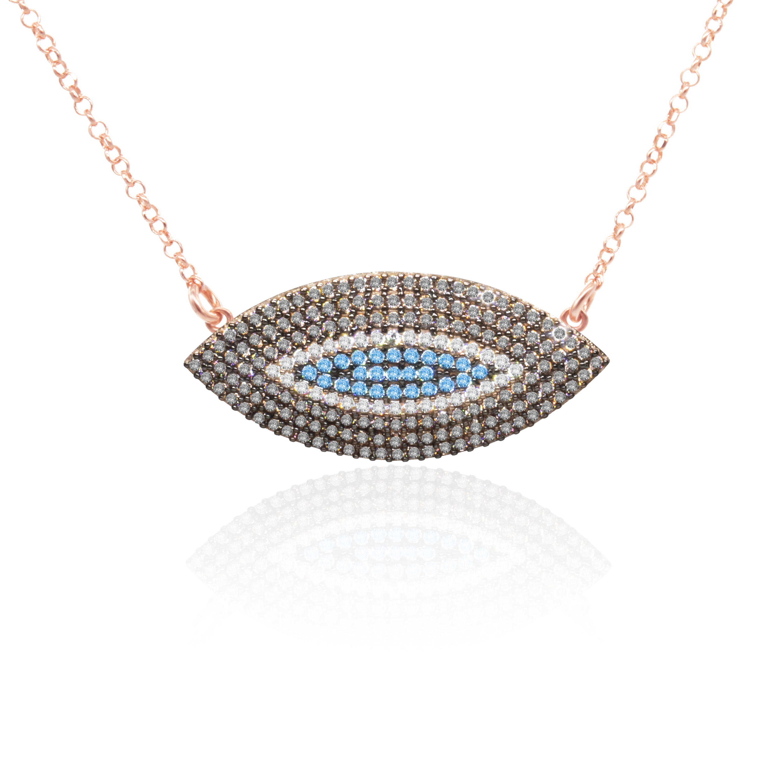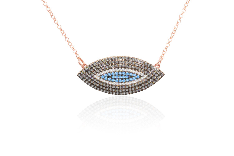 Evil Eye necklace made of rose plated sterling silver 925, decorated with light blue and brown cubic zirconia.