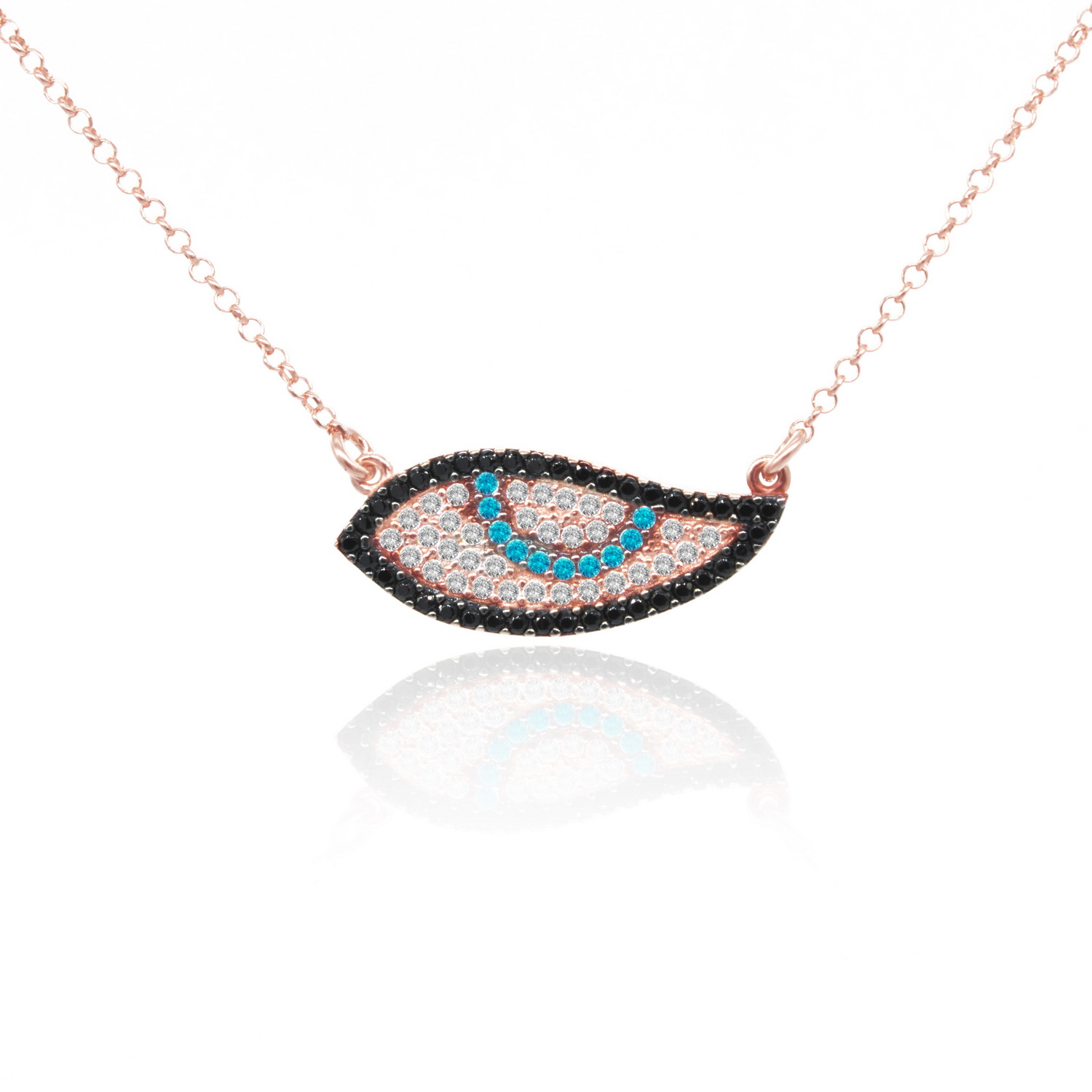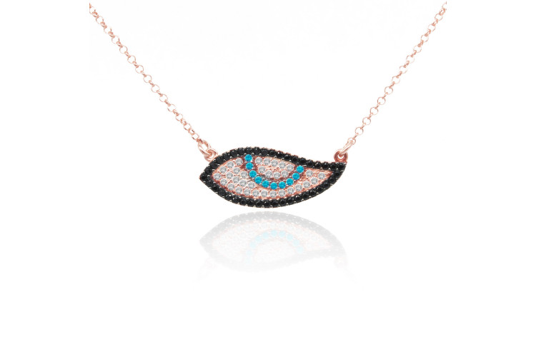 Evil Eye necklace made of rose plated sterling silver 925, decorated with white, black and light blue cubic zirconia.