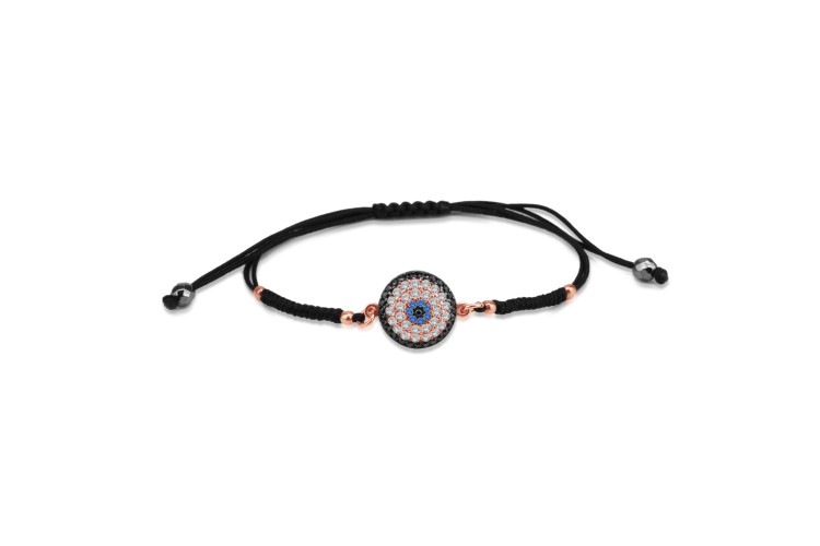 Evil Eye bracelet with black coloured cord made of rose plated sterling silver 925, decorated with black , light blue and white cubic zirconia.