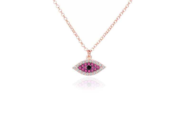 Evil Eye necklace made of rose plated sterling silver 925, decorated with white,red and black cubic zirconia.
